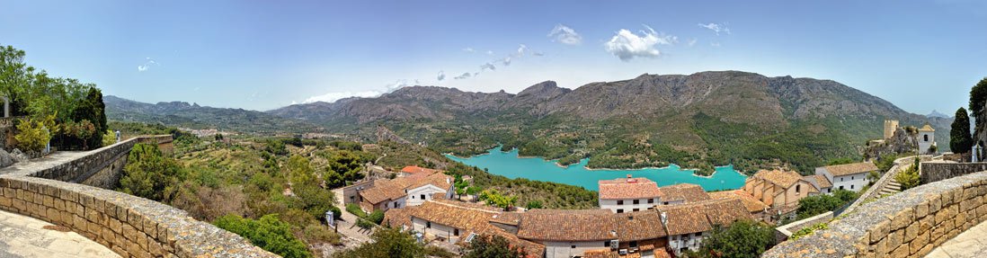 Guadalest is a small village on the Costa Blanca and it has become a very well-known and much visited tourist destination. In part this is because of its close proximity to Benidorm which allows for tours to be offered to Guadalest as it is only 30 minutes’ drive from the coast. Guadalest is a very pretty and historic small town and you will see the spectacular images of Guadalest on many Costa Blanca postcards. Guadalest is one of the most popular tourist attractions on the Costa Blanca. Guadalest is a village sitting on top of a mountain. The village appears perched on a tiny pinnacle rising into the sky which makes it look absolutely amazing. This gives beautiful views of the green valley with many other mountains in the background. Guadalest is famous for two buildings. First is Guadalest castle (Castell de Guadalest) which can only be accessed by walking through a 15 foot long tunnel carved out of the rock. This is known as the Portal de San Jose. When you get through the tunnel you see the old village houses and it feels like you have entered an ancient time. You can visit the restored house of the Orduna family to get an idea of what it used to be like living in ancient times in Guadalest. The streets of Guadalest are cobbled, there are little squares, a school and an old. Make sure you look to the right of Guadalest and you will see beautiful views of the valley which contains a dam and reservoir – the Embalse de Guadalest, built between 1953 and 1963. The other famous building that you will often see photographed or on postcards is the white bell tower of Penon de la Alcala which rises up seemingly precariously perched on the mountainside. The village of Guadalest only has about 200 inhabitants and needless to say most of these work in tourist related jobs. You will find many shops selling souvenirs, crafts and local produce such as honey, wine, handbags etc. Guadalest also has a number of small museums many of them converted from little caves in the mountainside. The castle at Guadalest was built by the Moors over 1,300 years ago. In 1609 King Felipe the third ordered all the Moors to be expelled leading to an uprising after which the Moors were defeated and left Spain. Also of note was in 1848 when powder kegs blew up (the reason is not known) the castle was abandoned.